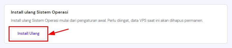 Mengklik Instal Ulang akan menghapus semua data saat ini dan membangun kembali VPS dengan OS dan panel yang sama seperti yang diinstal sebelumnya.