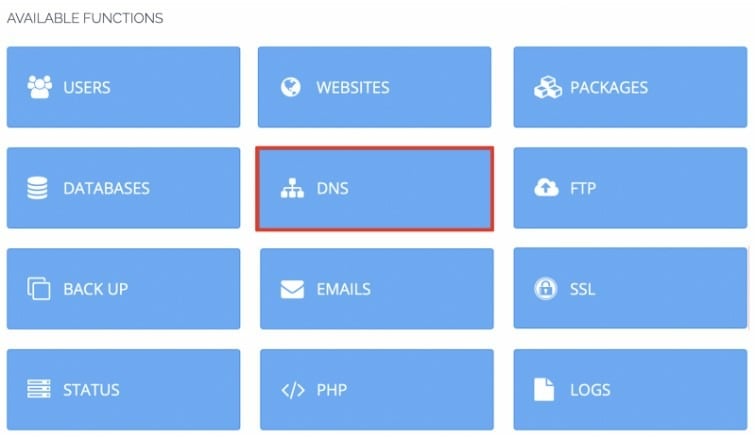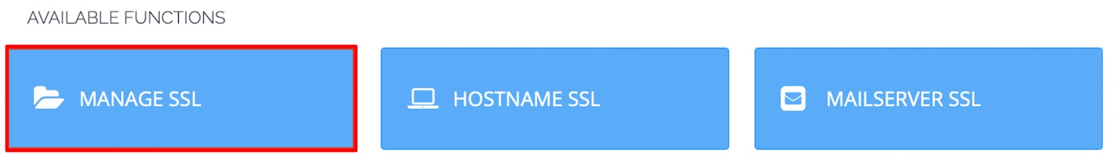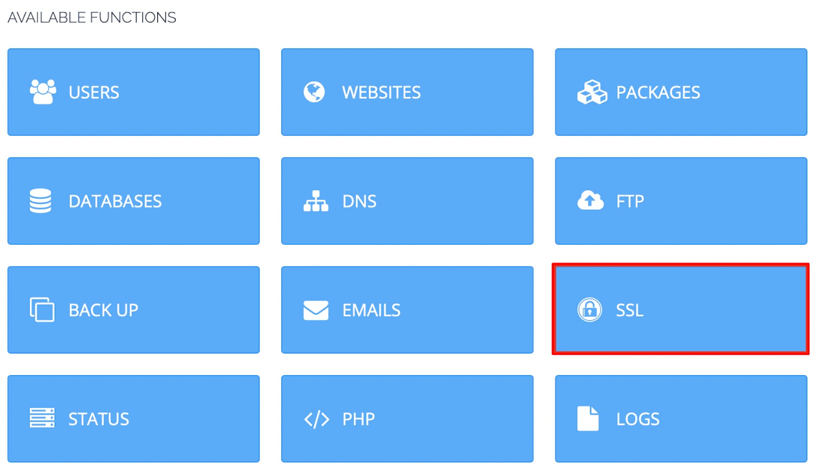 Dengan CyberPanel, Anda bisa membuat sertifikat SSL secara otomatis. Sebaiknya domain diarahkan oleh NS ke VPS terlebih dahulu. Untuk melakukannya, klik SSL pada bagian Available functions: