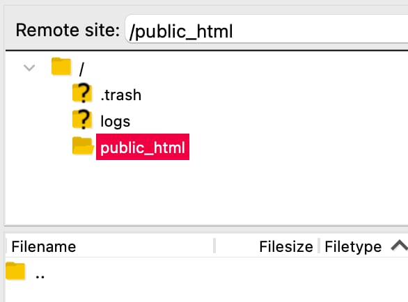 Setelah terhubung ke akun, buka folder public_html (atau folder yang akan jadi tujuan file unggahan) yang ada di sisi kanan layar: