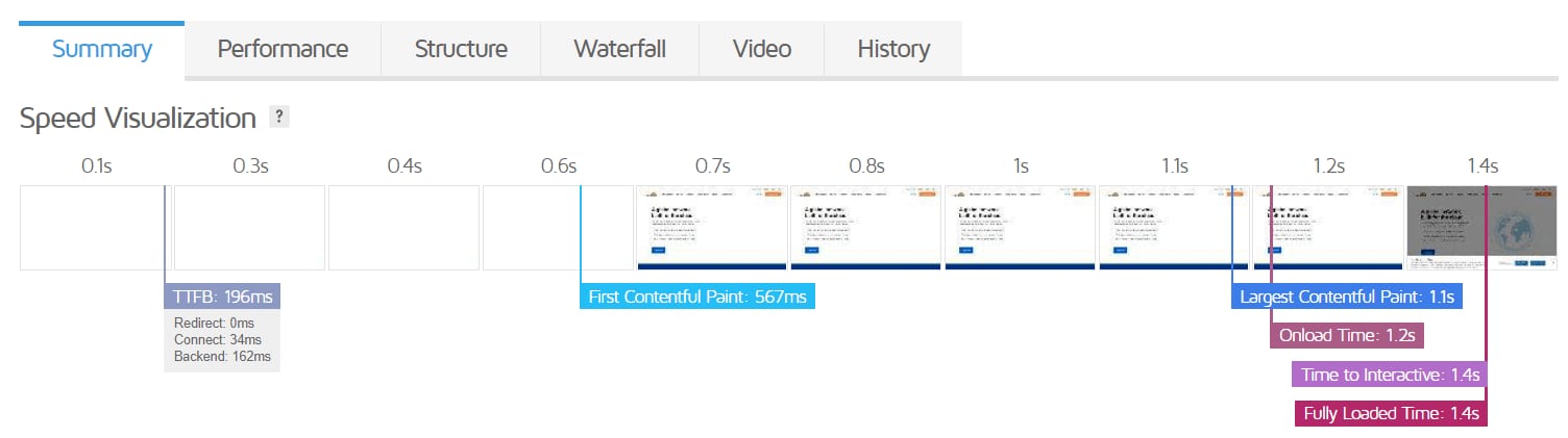 Tepat di bawah skor, Anda dapat melihat opsi Speed Visualization (Visualisasi Kecepatan). Bagian ini menunjukkan waktu yang dibutuhkan untuk memuat semua elemen website dan waktu yang dibutuhkan pengunjung untuk berinteraksi dengan website: