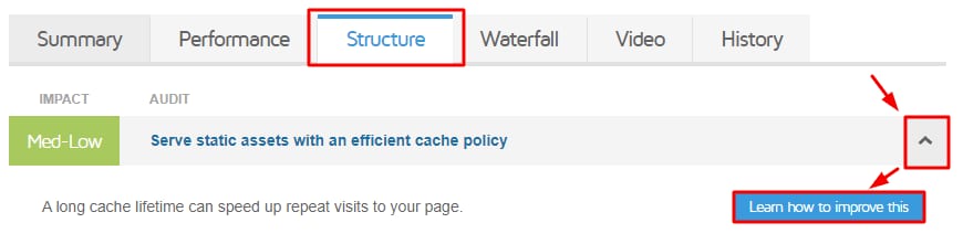 Klik tanda panah di sebelah kanan untuk melihat penjelasan lebih lengkap tentang kendala tersebut. Selain itu, GTmetrix juga membagikan cara untuk memperbaiki kendala pada website. Untuk mengetahui solusi yang diberikan GTmetrix, klik tombol Learn how to improve this: