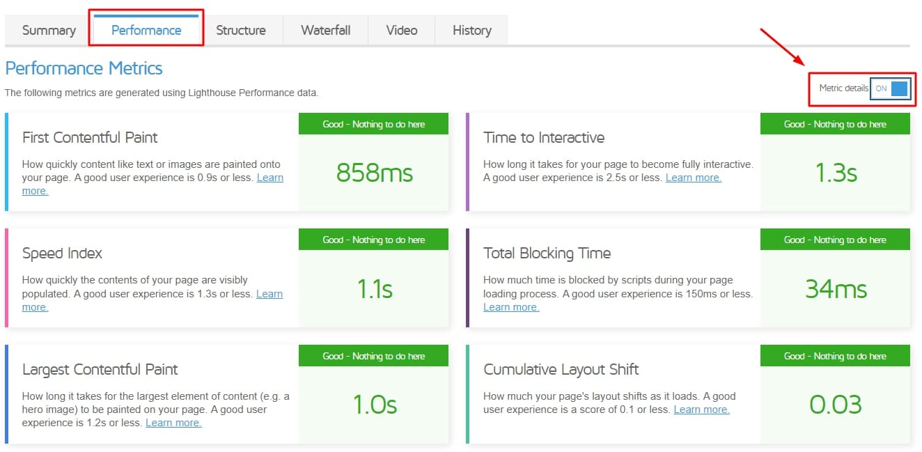 Bagian Performance (Performa) menyediakan penjelasan mendalam tentang masing-masing metrik dan value yang direkomendasikan. Untuk melihat informasi yang lebih jelas, klik toggle Metric details (detail metrik):