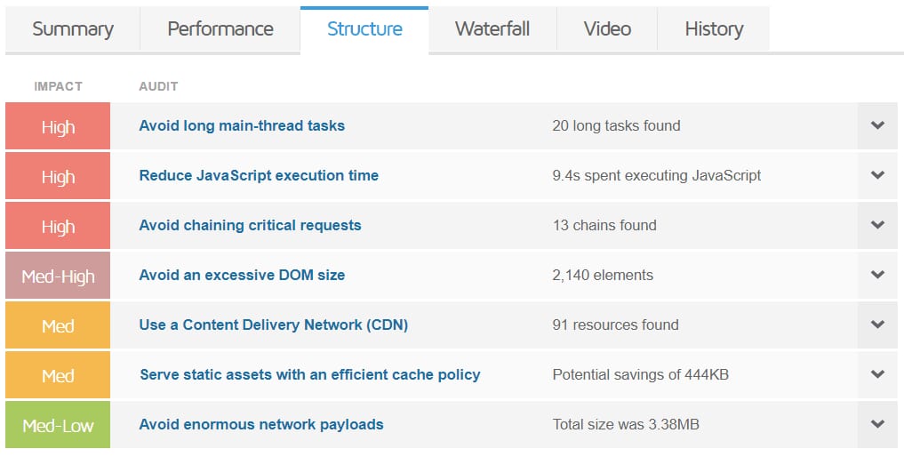 Setelah mengetahui Top Issues atau kendala utama pada website, buka tab Structure (Struktur). Bagian ini menampilkan daftar lengkap kendala pada metrik performa website dan memberi label khusus untuk metrik yang perlu diperbaiki atau ditingkatkan kualitasnya. Kami sarankan untuk mengatasi kendala yang diberi label High dan Medium terlebih dahulu.