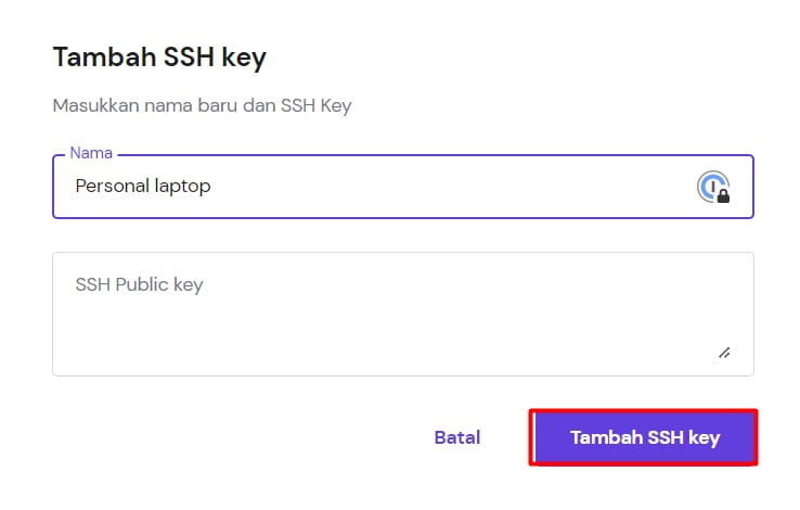 Pada bagian Tambah SSH Key, salin konten ke kolom 1 dan klik Tambah: