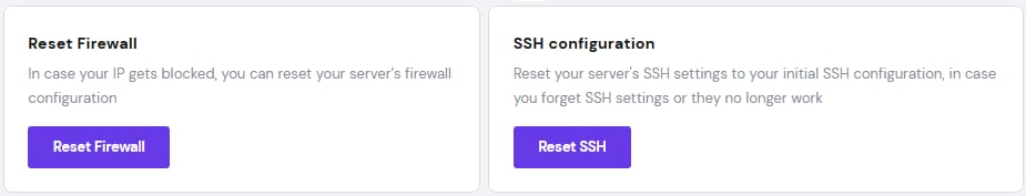 Jika Anda menggulir sedikit ke bawah, Anda akan melihat tombol untuk Setel ulang firewall o Reset SSH, opsi ini akan membantu Anda jika VPS Anda diblokir: