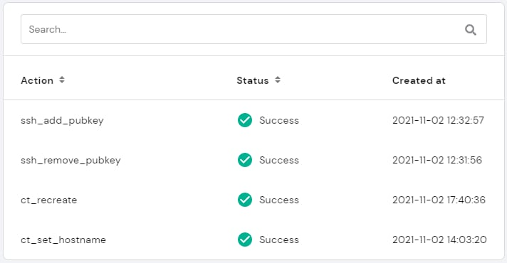 Di bagian ini, Anda dapat melihat semua tindakan terbaru Anda, seperti memulai ulang atau mematikan VPS Anda, mengubah sistem operasi Anda, atau memulihkan cadangan. Jika Anda melihat tindakan yang gagal, pastikan untuk menghubungi tim Customer Success dan kami akan membantu Anda:
