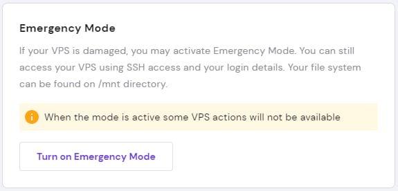 Bagian ini memberi Anda kemampuan untuk mengaktifkan mode darurat, yang sangat penting saat mengakses VPS yang rusak melalui SSH: