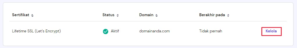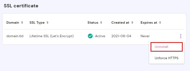 Jika sertifikat SSL yang di-uninstall adalah Lifetime SSL dari Hostinger, maka sertifikat SSL akan muncul di dashboard setelah selesai di-uninstall.