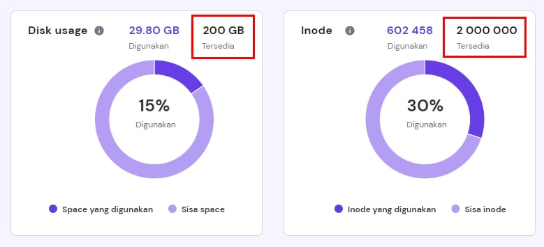 Setiap paket hosting memiliki limit kapasitas penyimpanan dan inode masing-masing. Anda dapat mengetahui limit paket hosting melalui website kami atau pada bagian Penggunaan Resource di hPanel: