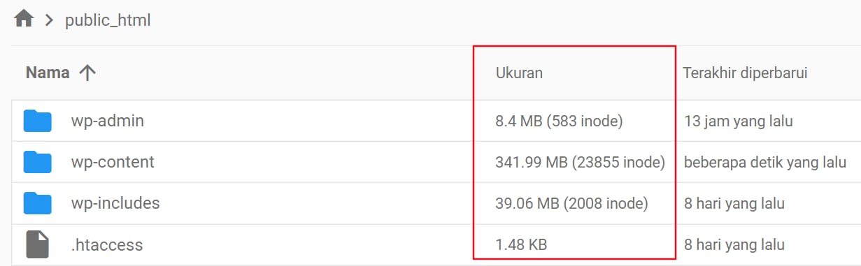 Pada halaman yang terbuka Anda bisa melihat ukuran direktori dan inode di kolom Ukuran: