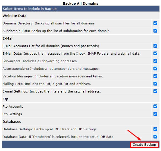 Pilih data yang akan di-backup dan klik tombol Create Backup: