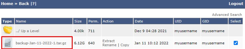 Klik file backup yang ada di File Manager: