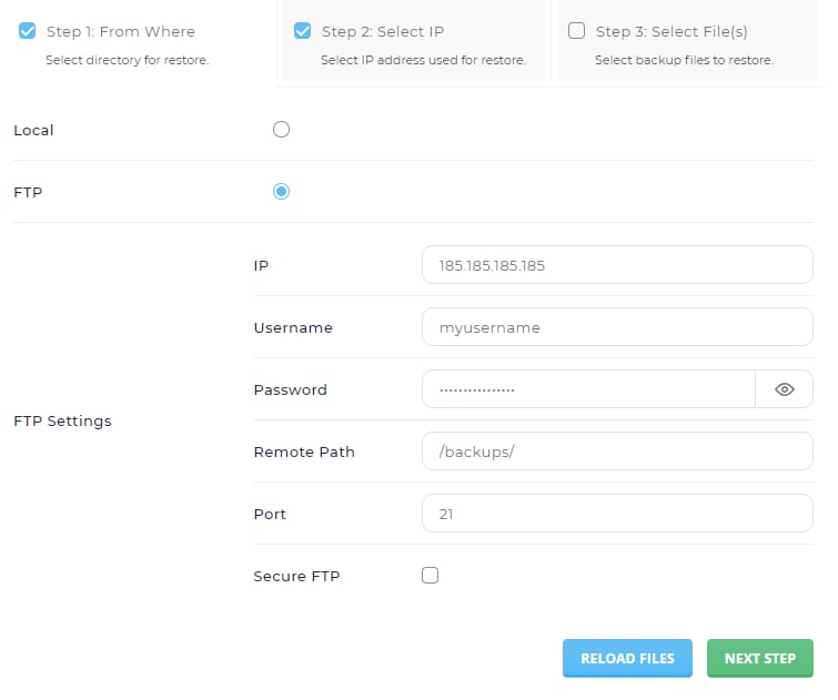 Pilih FTP dan masukkan detail FTP layanan sebelumnya: