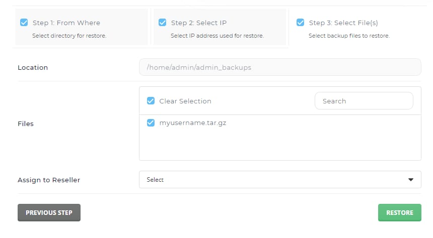 Pilih file backup dan klik restore: