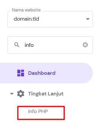 Versi PHP Anda dapat diatur di menu Konfigurasi PHP. Untuk melihat versi PHP saat ini, buka Websites → Kelola, lalu cari Info PHP di menu bar dan klik: