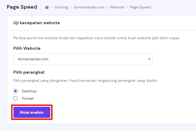 Pilih website dan jenis perangkat, dan klik Mulai analisis: