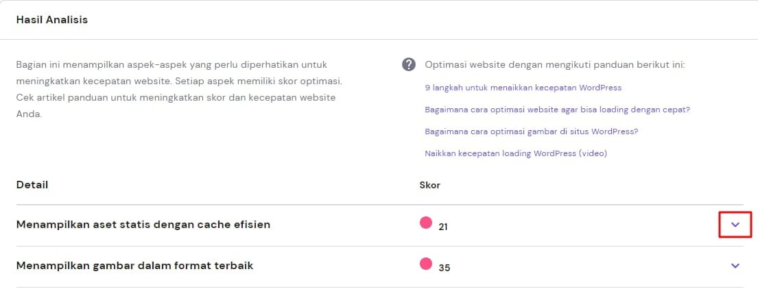 Klik ikon tanda panah untuk melihat penjelasan lebih lengkap dan solusi meningkatkan skor: