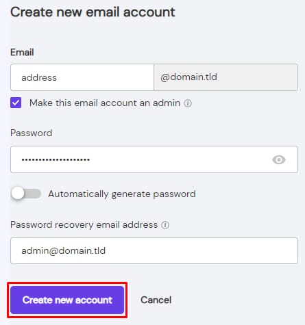 Masukkan alamat email dan beri centang jika Anda ingin menjadikan email tersebut sebagai admin. Lanjutkan dengan buat kata sandi, tambahkan alamat email pemulihan kata sandi dan klik Create new account: