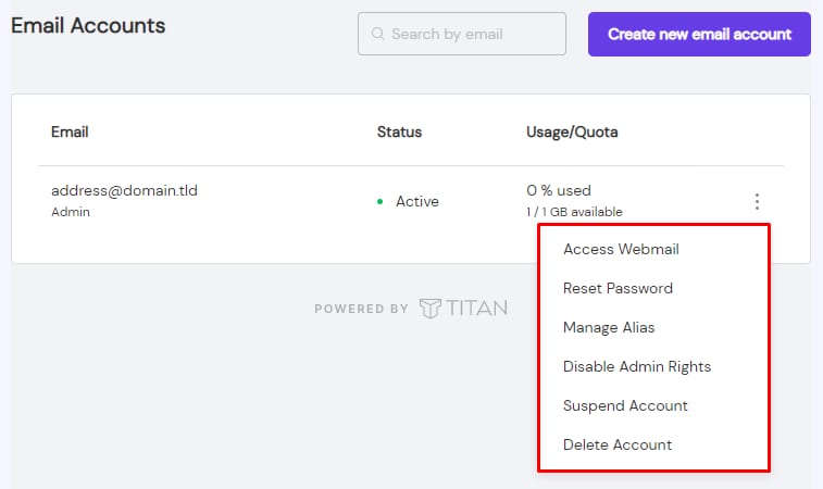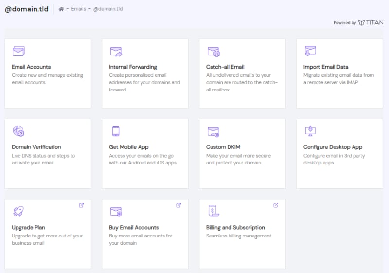 Anda bisa mengelola email dari Akun Email di hPanel. Caranya: buka menu Email dan pilih nama domain. Berikut tampilannya di Akun Titan Email: