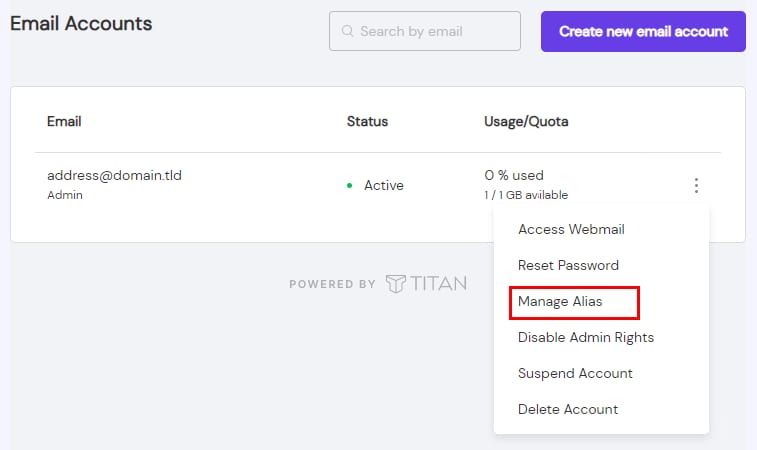 Email alias adalah nama alternatif untuk akun email Anda. Untuk membuatnya, buka Email → pilih domain → Akun Email: