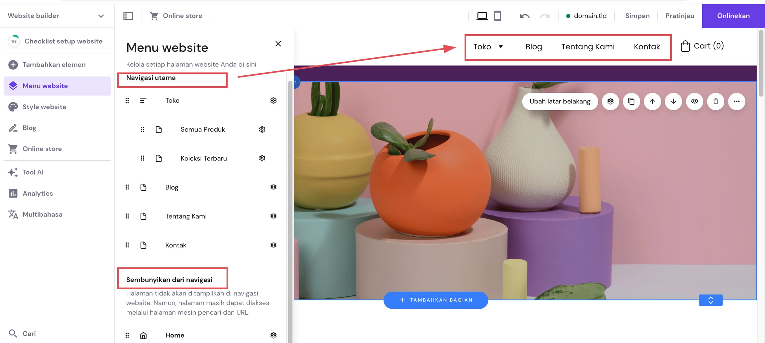 Semua halaman di Navigasi utama bisa dilihat di tab menu website. Namun, halaman yang berada bagian Sembunyikan dari navigasi tidak akan ditampilkan di menu navigasi website.