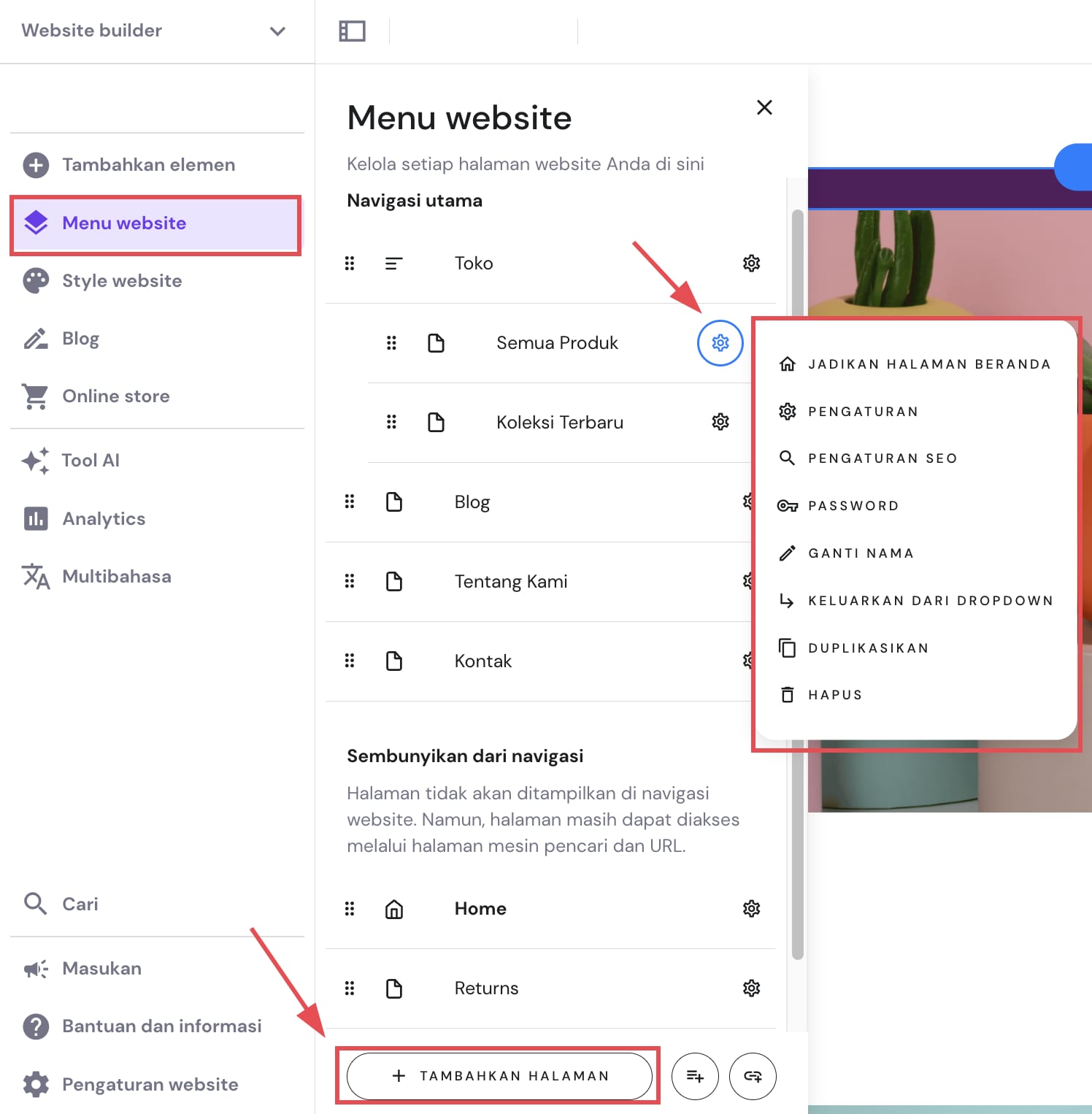 Di Website Builder Hostinger, semua halaman website dikelola dari panel Menu website di sebelah kiri: