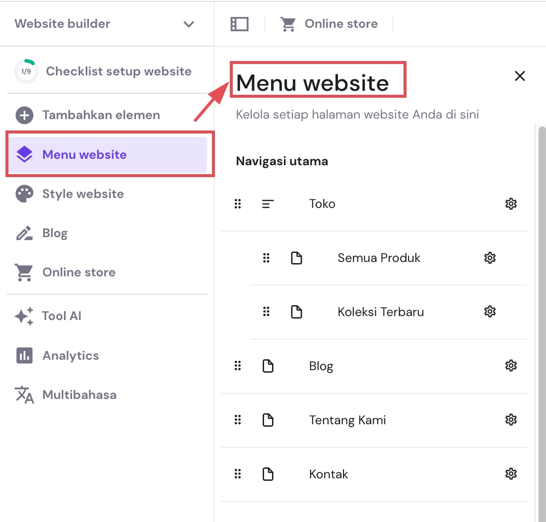 Di panel Menu website, Anda bisa: