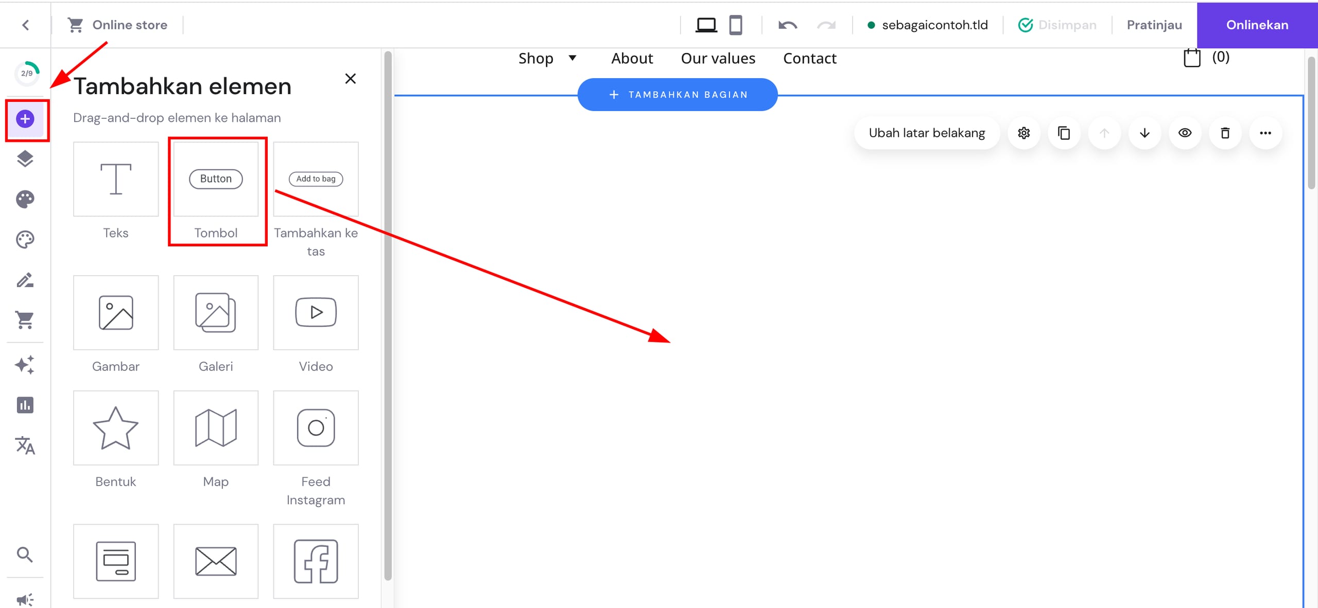 Di bagian editor, klik Tambahkan Elemen, lalu klik elemen tombol, dan letakkan di bagian yang telah dipilih.