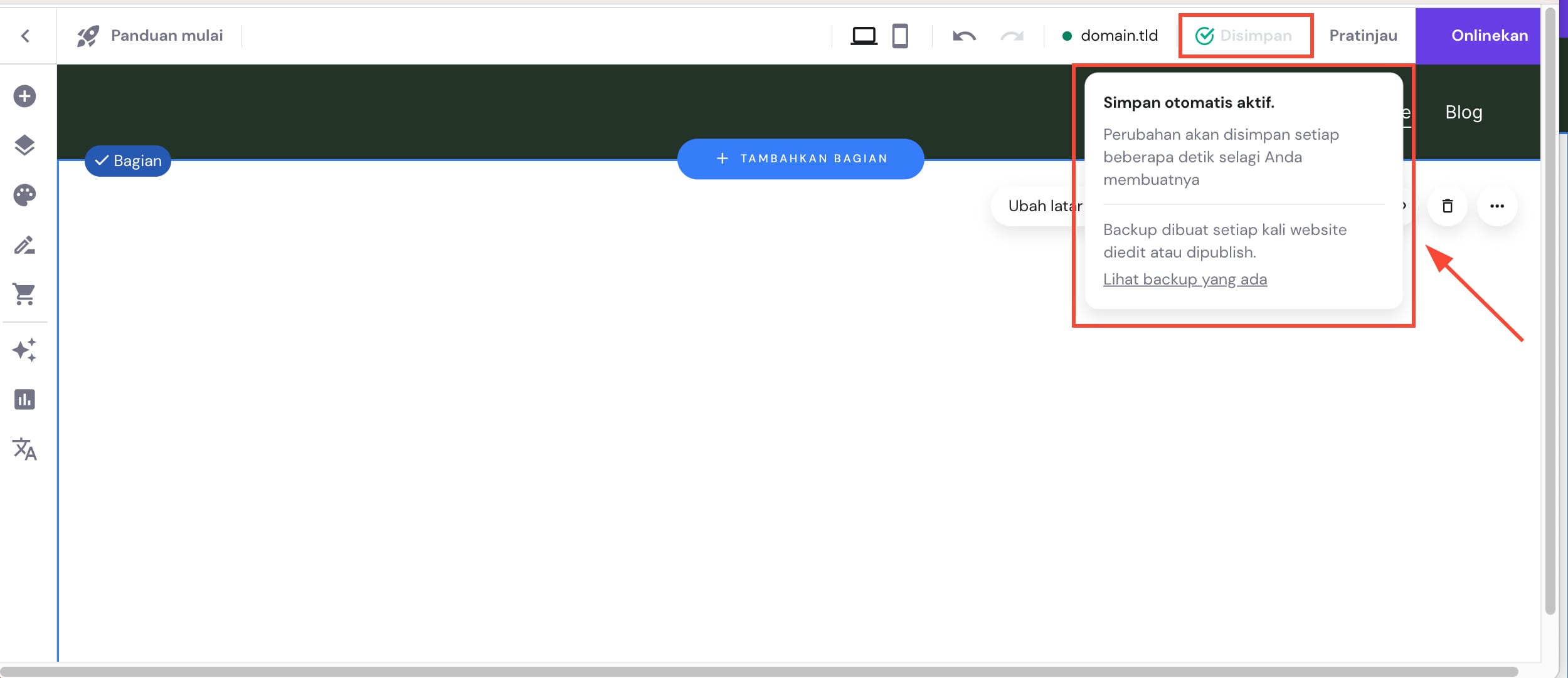 Jika Anda ingin restore versi tertentu dari website, arahkan mouse ke tombol Simpan di bagian kanan atas, lalu klik Lihat backup yang ada: