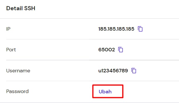 Password FTP = password SSH. Jika Anda mengubah password FTP domain utama Anda, maka secara otomatis password SSH juga akan diubah.