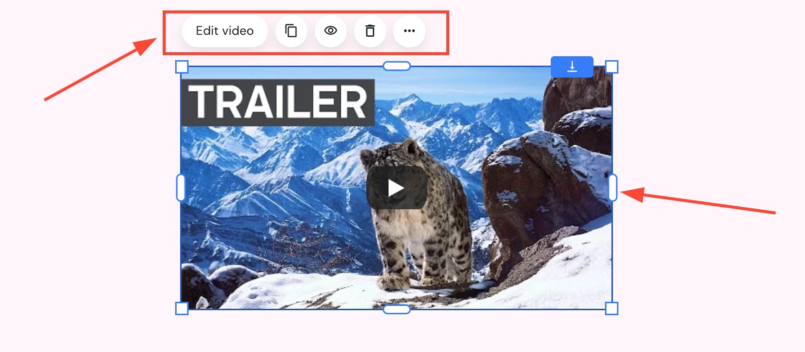 Klik elemen video untuk melihat opsi lainnya (edit, duplikasikan, hide/show, hapus, resize):