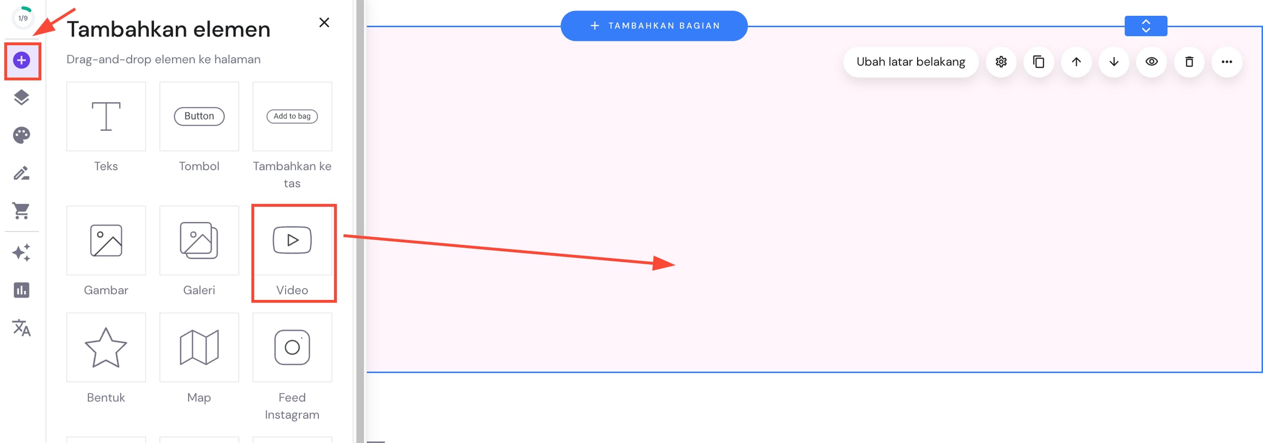 Di bagian editor, klik Tambahkan Elemen di panel sebelah kiri. Pilih elemen video dan tarik video di tempat yang Anda inginkan: