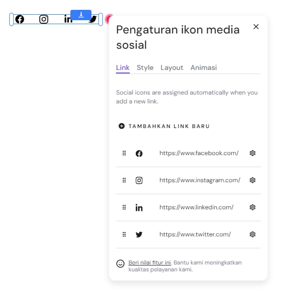 Klik pada roda gigi pengaturan di samping ikon yang disarankan (Twitter, Facebook, Instagram, LinkedIn) dan masukkan tautan Anda, atau klik Tambahkan Link Baru untuk menambahkan tautan ke platform media sosial lainnya