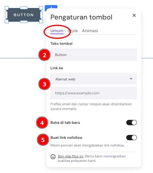 URL – masukkan URL apa pun; ini juga memungkinkan Anda untuk menautkan ke bagian tertentu pada website Anda
