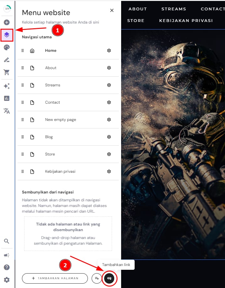 Pada editor, buka panel Menu website di sebelah kiri