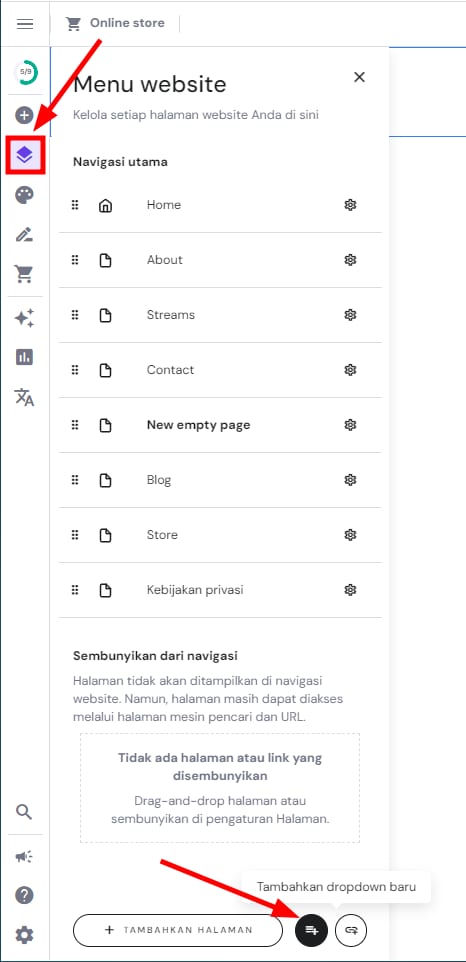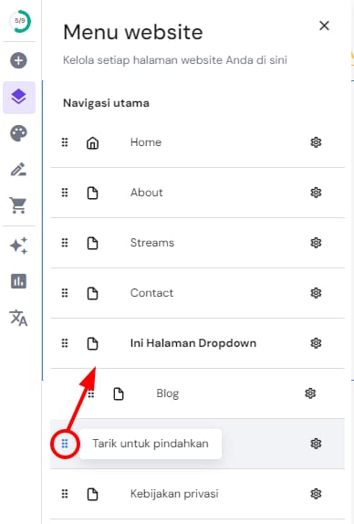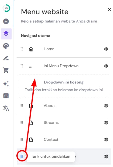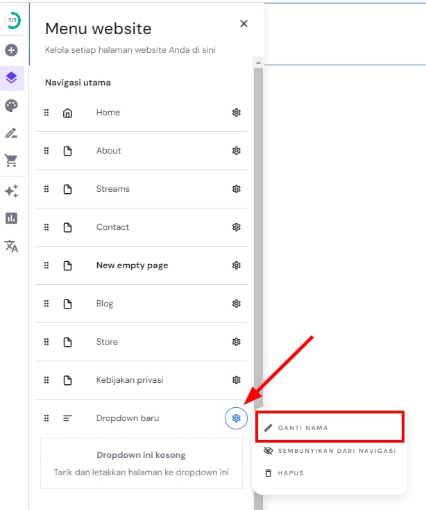 Halaman atau tautan yang dihapus dari dropdown tidak akan terhapus dari website; sebagai gantinya, halaman atau tautan tersebut akan menjadi halaman atau tautan tersendiri yang bisa muncul dari menu navigasi website Anda.