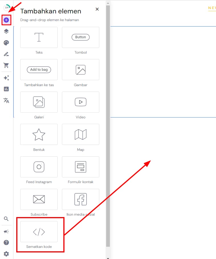 Di editor, buka panel Tambahkan elemen di sebelah kiri dan seret elemen sematkan kode ke tempat yang Anda inginkan pada halaman: