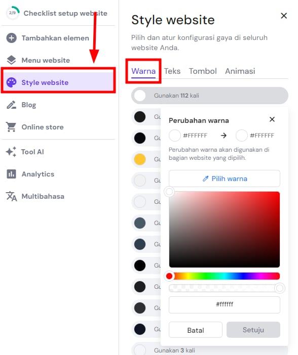 Pada editor, buka panel Style website di sebelah kiri dan klik tab Warna. Di sini, Anda dapat menemukan semua warna yang digunakan di seluruh halaman website Anda. Warna yang paling sering digunakan akan muncul paling atas pada daftar. Klik Ubah disebelah warna yang ingin Anda ubah, pilih warna yang baru, dan Builder akan mengubah warna tersebut di seluruh halaman website Anda: