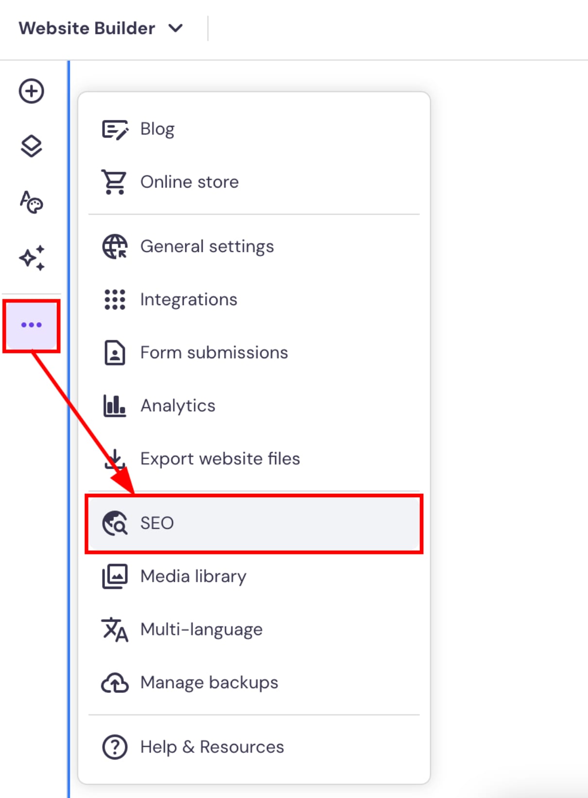 Untuk menemukan pengaturan umum SEO, akses Website Builder dan buka Pengaturan Website → SEO: