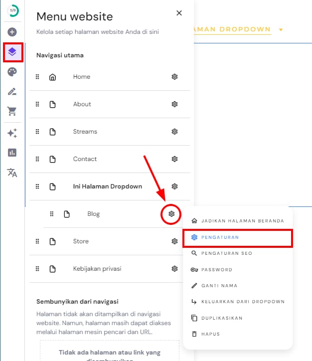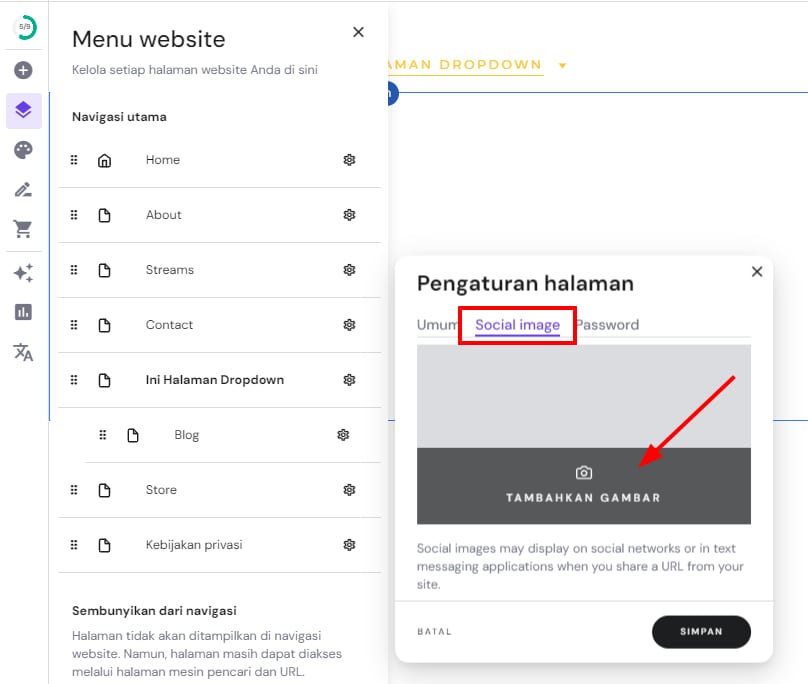 Untuk menambahkan gambar pratinjau untuk masing-masing halaman website, klik Menu website di sebelah kiri dan buka pengaturan halaman: