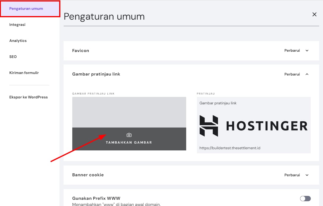 Anda bisa mengunggah gambar pratinjau umum website Anda pada pengaturan umum website. Klik Tambahkan Gambar atau Ganti Gambar dan unggah gambar Anda: