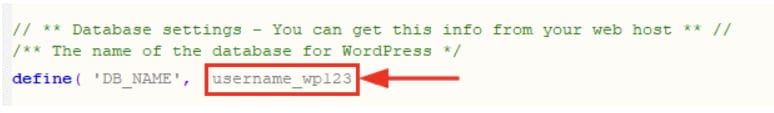 Anda bisa mengidentifikasi database yang sesuai untuk setiap website Anda dengan membuka file the wp-config.php website menggunakan aplikasi notepad. Nama database akan muncul di sebelah parameter DB_NAME: