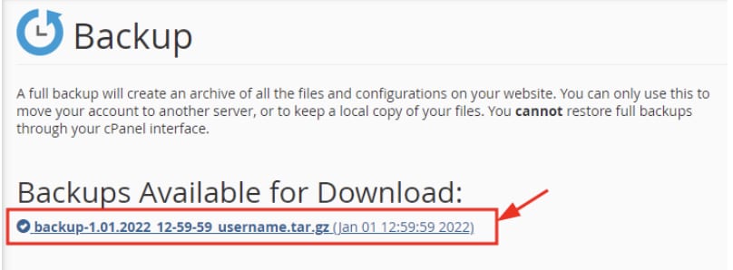 Di jendela berikutnya, klik Download a Full Account backup. Anda bisa memilih dari daftar backup yang telah dibuat, jika tidak tersedia, Anda bisa membuat backup baru. Download backup yang Anda inginkan dengan cara klik link di bawah ini: