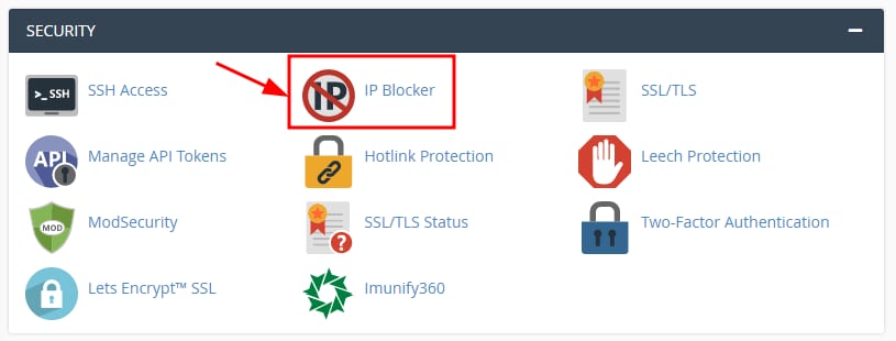 Dari cPanel, Anda bisa memblokir alamat IP tertentu agar tidak bisa mengakses website Anda. Caranya: lihat bagian Security dan klik IP Blocker: