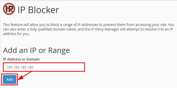Masukkan IP atau range IP yang ingin diblokir dan klik Add: