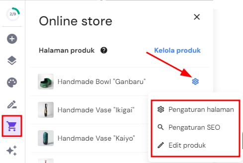 Terdapat tiga pengaturan yang bisa Anda akses – Pengaturan halaman, Pengaturan SEO, dan Edit produk: