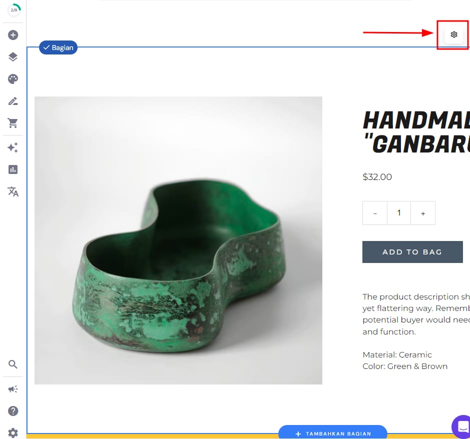 Anda juga bisa mengubahsuaikan masing-masing halaman produk dengan menambahkan lebih banyak bagian dan menempatkan berbagai elemen di dalamnya.