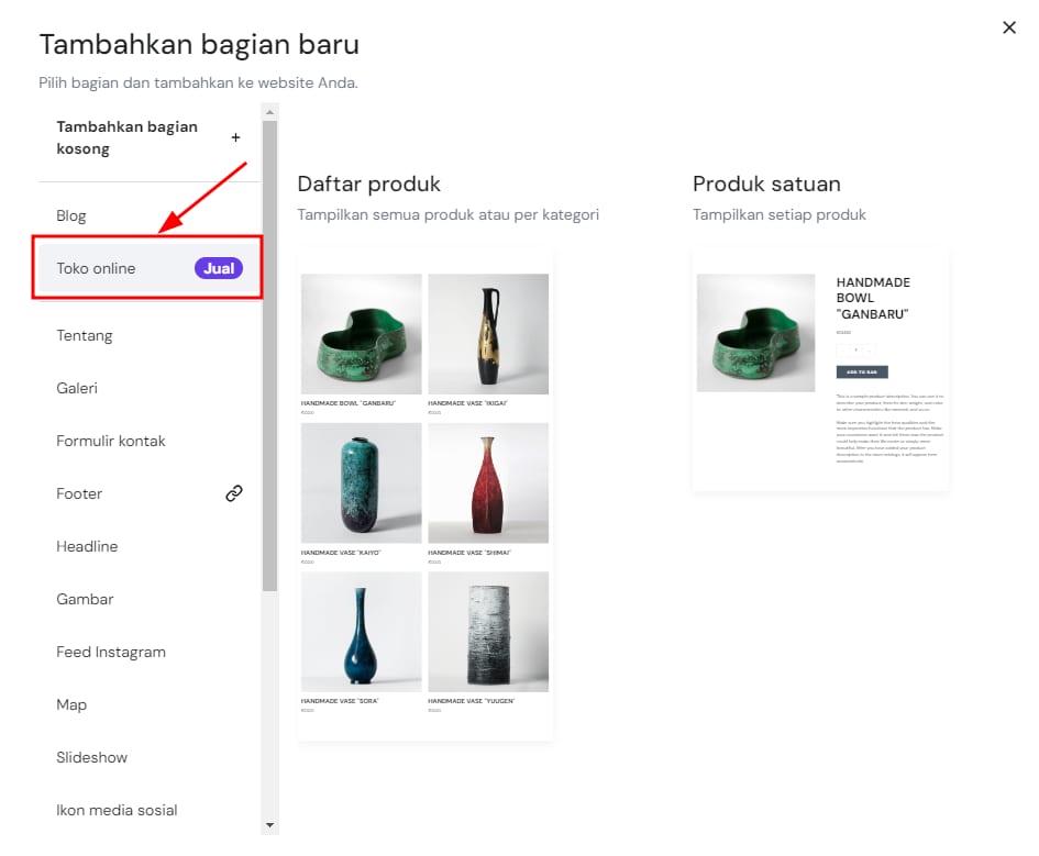 2. Pada tampilan Tambahkan Bagian Baru, pilih Toko Online. Di sebelah kanan, Anda akan menemukan dua jenis bagian produk – daftar produk dan produk satuan – klik pada bagian yang diinginkan dan bagian tersebut akan dimasukkan pada website Anda: