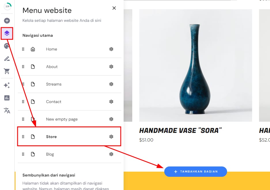 1. Di Website Builder, klik tombol Menu website di sebelah kiri dan buka halaman yang akan Anda gunakan untuk menampilkan produk. Pada halaman tersebut, klik tombol Tambahkan bagian: