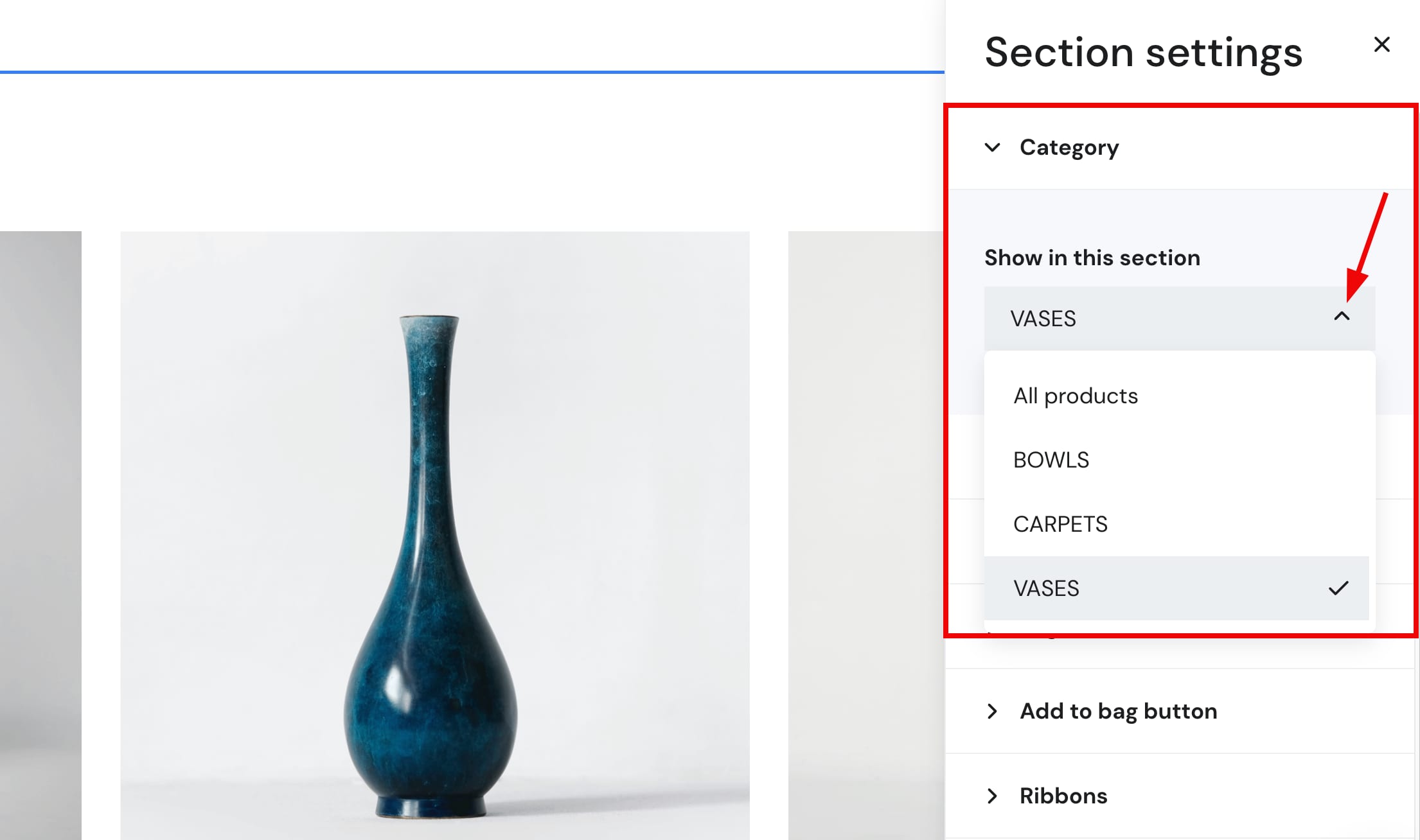 Untuk menampilkan kategori produk, tambahkan bagian produk ke halaman website.